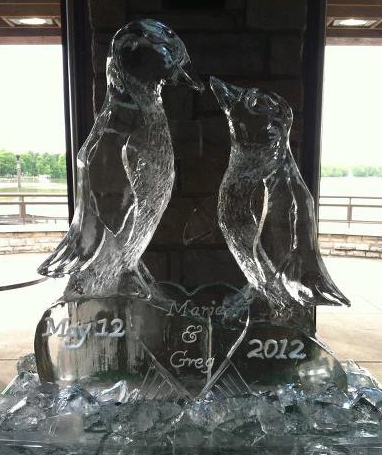 If you have a hobby or something you are both interested in, we can take that idea an transform it into ice. This couple loved penguins, so we carved their names in a heart below two kissing penguins.