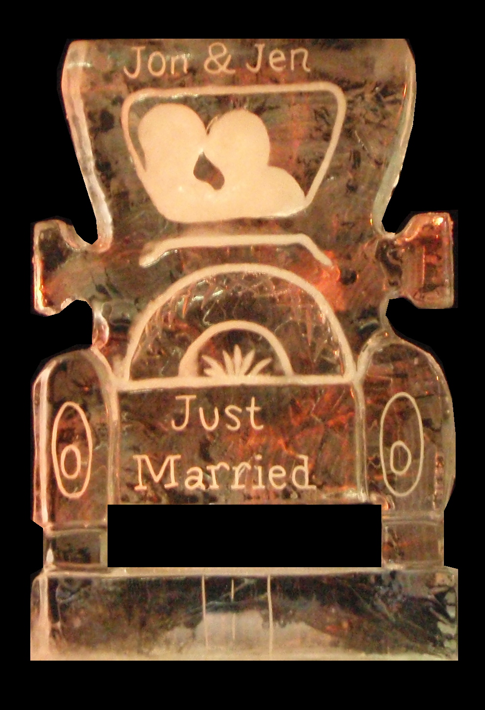 Having an ice sculpture with both of your names is a classic idea, but can still be unique. For this wedding, we carved an old time car that says “Just Married” along with their names. You can see the silhouette of the couple in the car window.