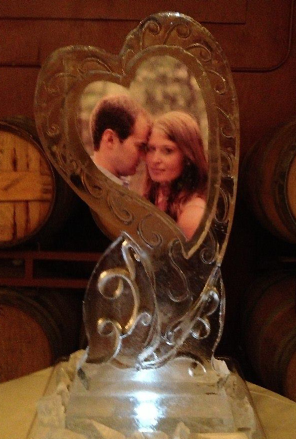We can freeze just about anything into your sculpture—that includes a photograph. Why not have your engagement photo incorporated into the sculpture? This option is becoming more popular, as the bride and groom want to have more uses for their photos.